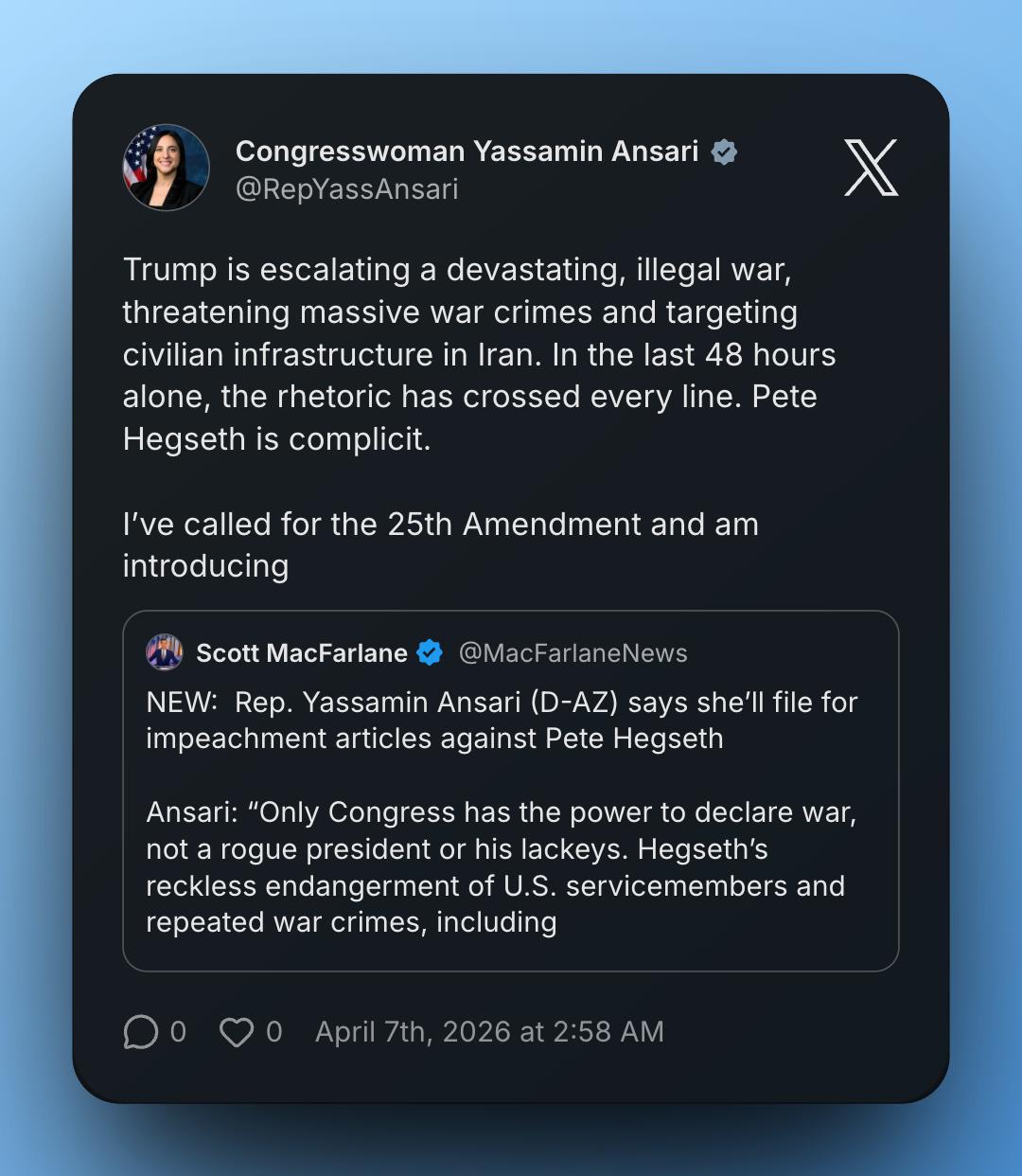 Congresswoman Yassamin Ansari announced she is calling for the 25th Amendment and introducing Articles of Impeachment against US Secretary of War Pete Hegseth, accusing the Trump administration of escalating an illegal war and threatening war crimes in Iran.