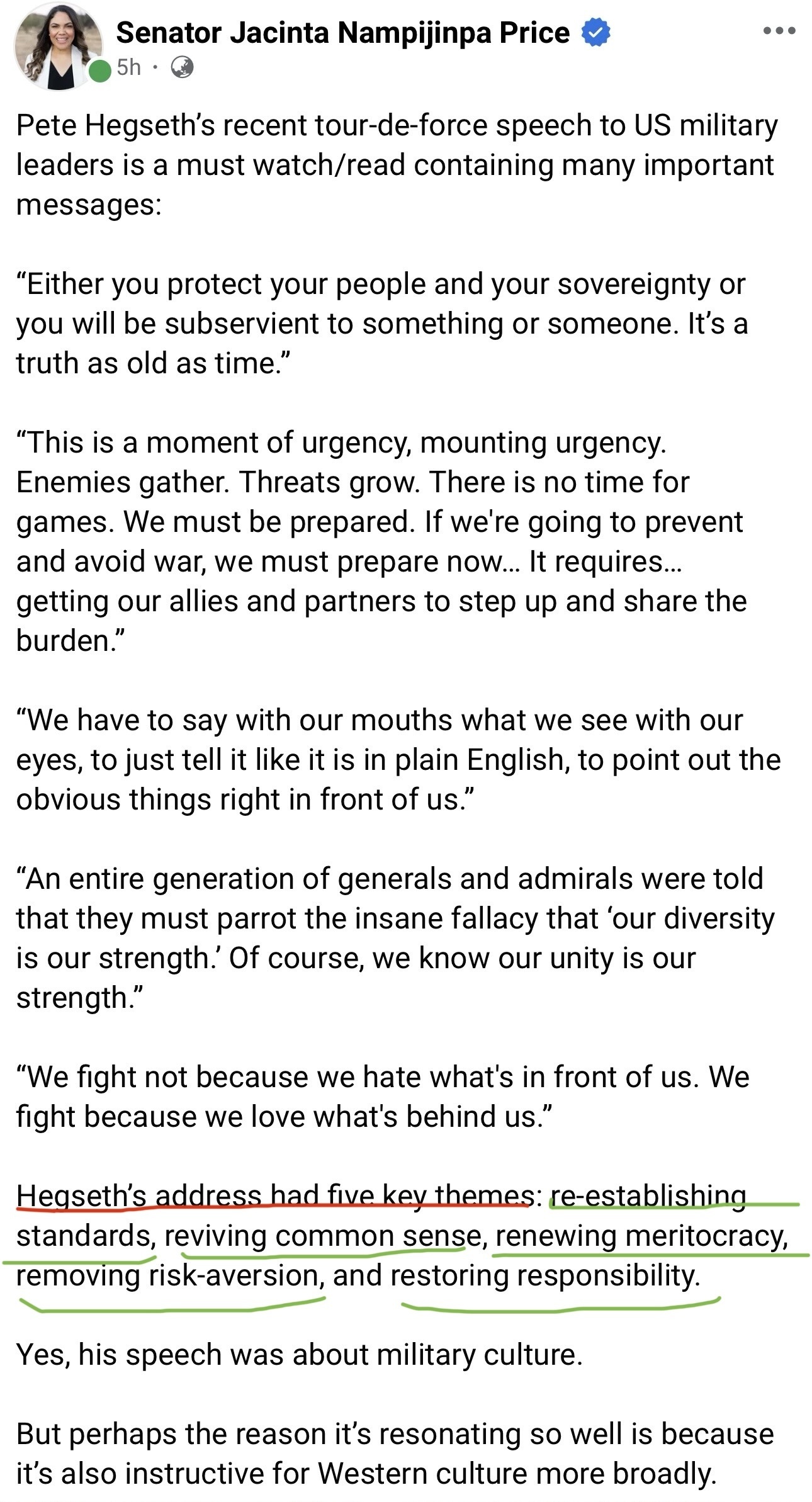 has expressed her view on the Hegseth “talk” to the U.S. military’s top brass.