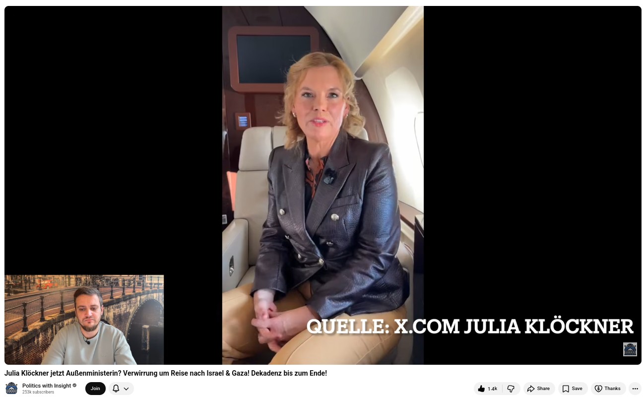 Meanwhile: Julia Glöckner resident of the German Bundestag goes to Israel in the State Airbus for unclear reasons, but delivers all the usual kant about Israel, Hamas attacks, Democracy in the Middle East and "right to exist" from the plane weirdly dressed in a ... black leather jacket?
