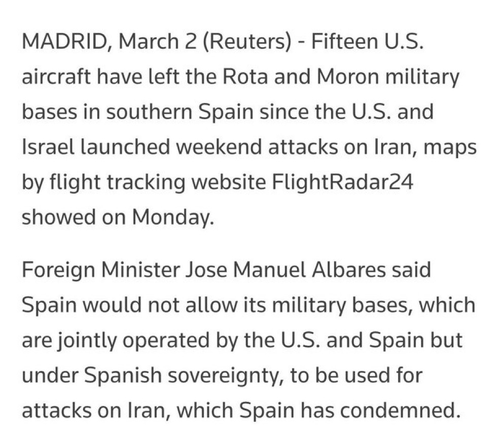 2. Spain ordered the US to pull out their tanker aircraft as it does not want that Spanish territory is used for this conflict