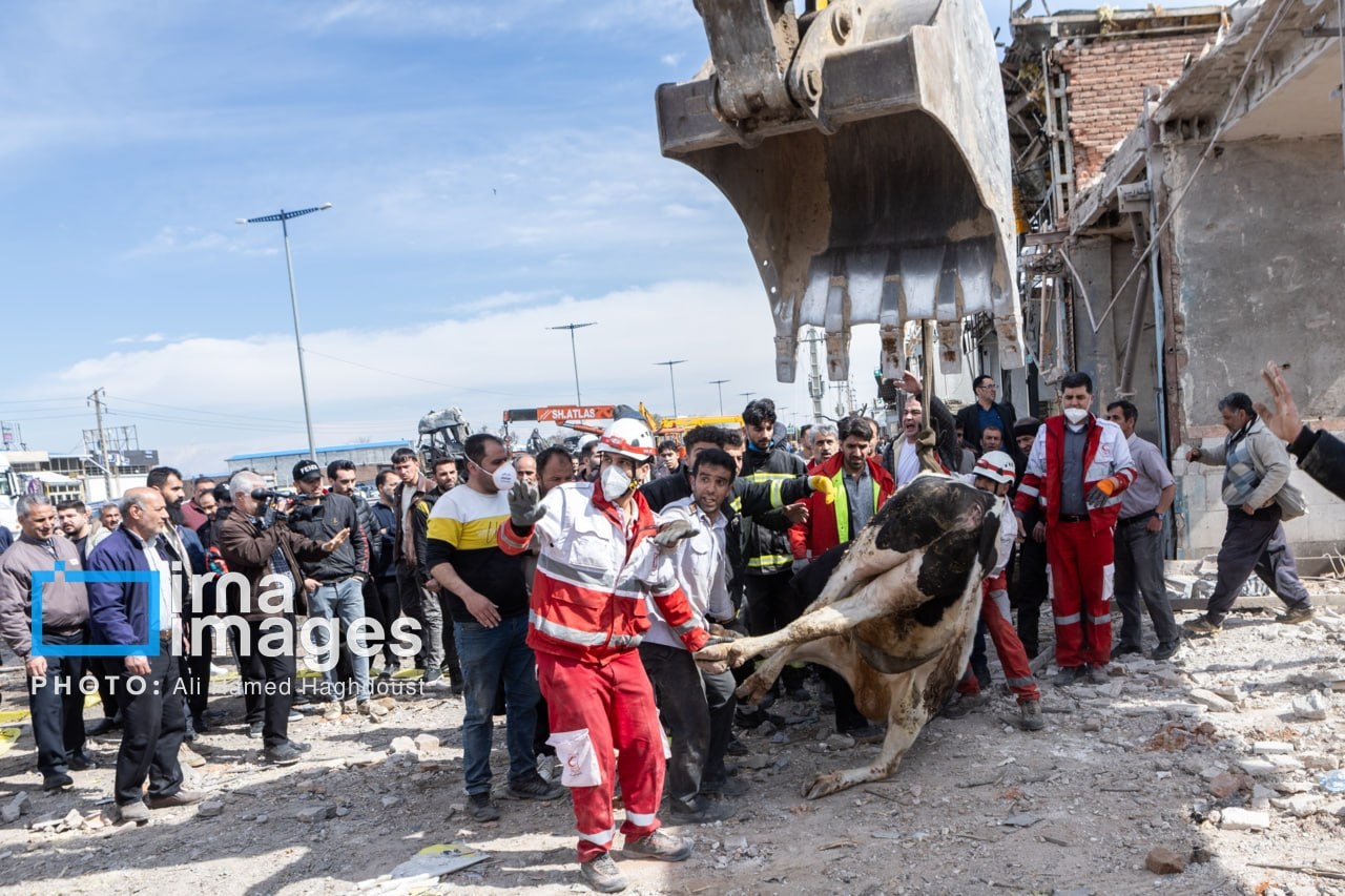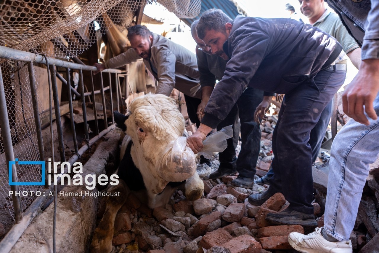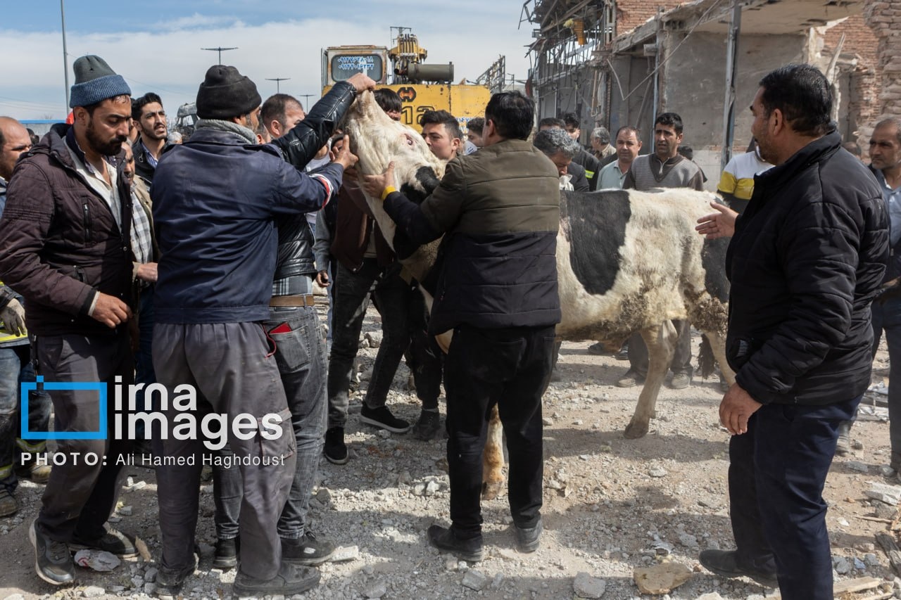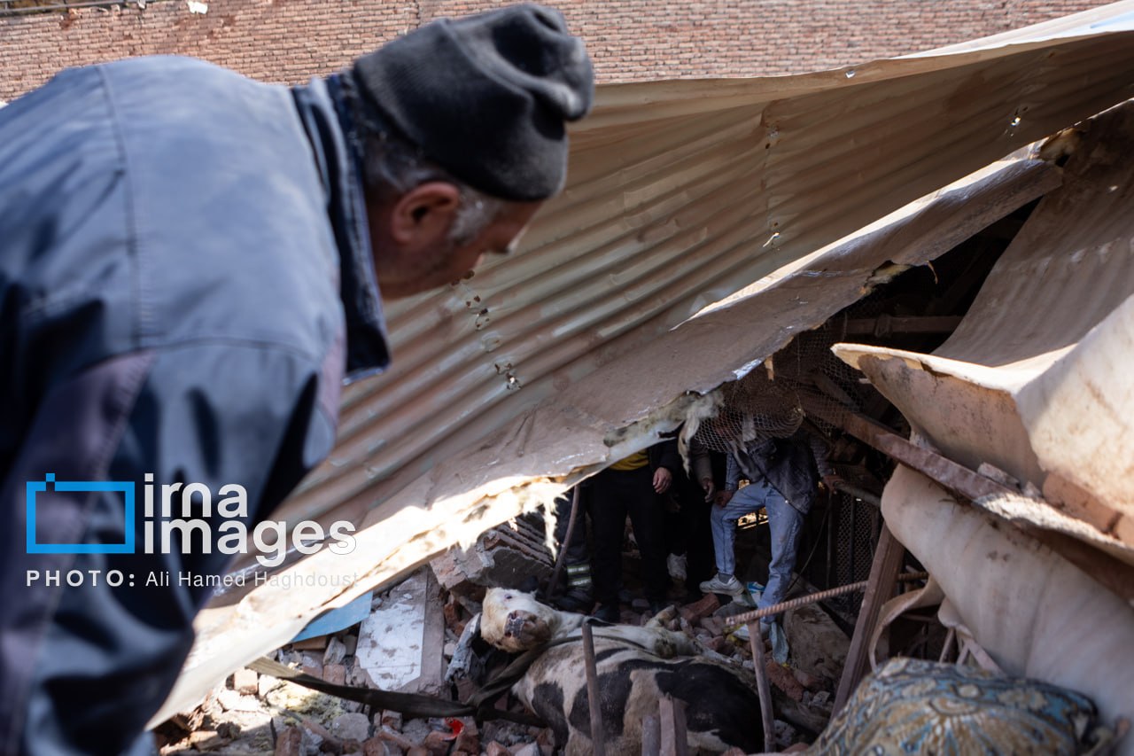 A livestock farm near the northwestern Iranian city of Tabriz was damaged in a US-Israeli attack, with rescue teams working to save animals trapped under the rubble.