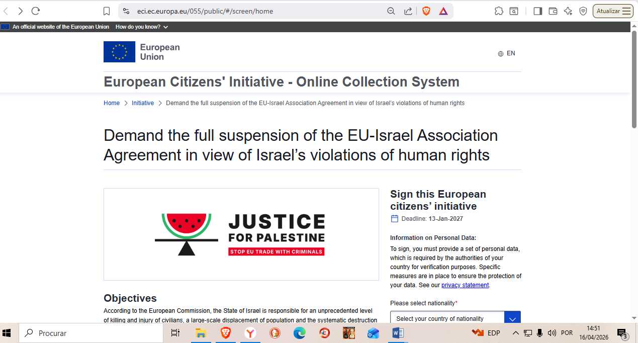 European Citizens' Initiative (ECI) to suspend the EU Israel Association Agreement has passed the threshold for 11 countries and at 1,034,599 signatures now.