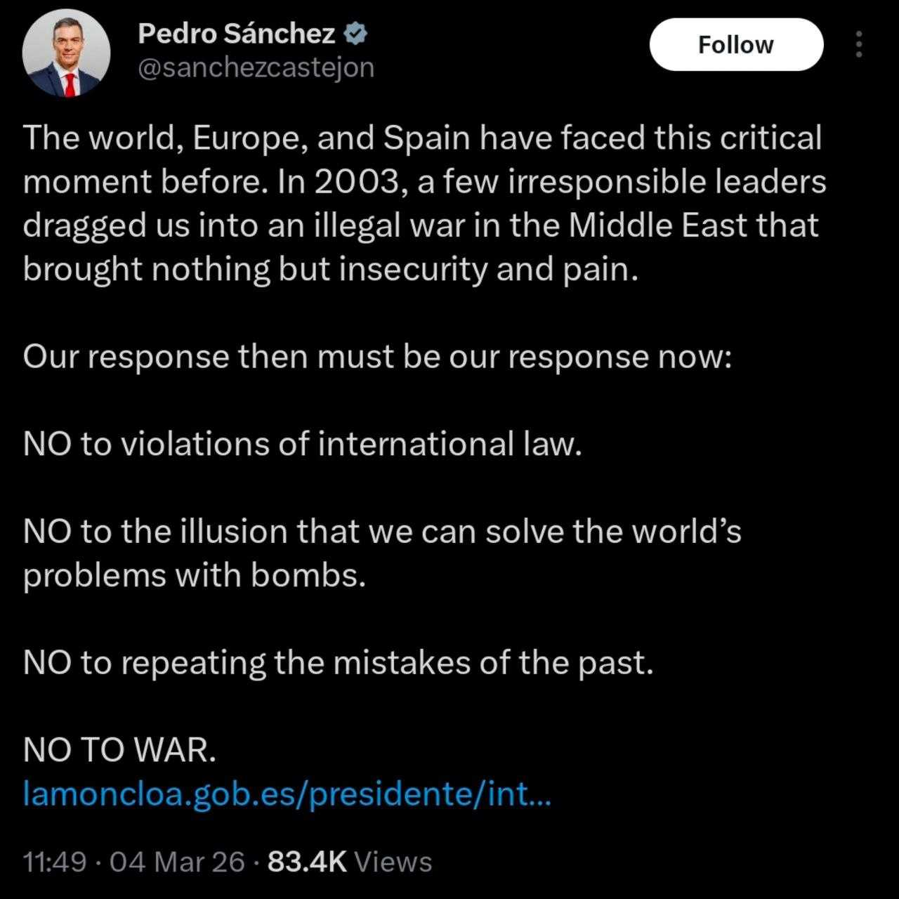 President Pedro Sanchez of Spain states his opposition to the Iran war.