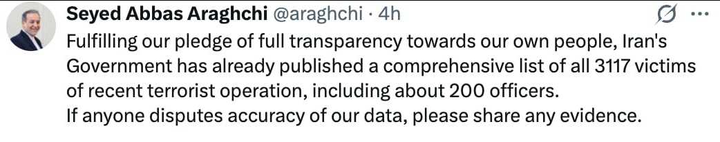 Iranian Foreign Minister Abbas Araqchi demands evidence from Donald Trump after his statement that 32,000 protesters were allegedly killed in Iran.