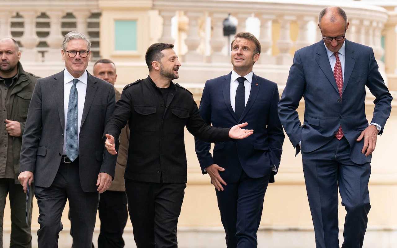 @theduran Alex correctly included image picked by Telegraph to depict great unity: but what about another one taken from BBC https://www.bbc.co.uk/news/articles/cg7vdd115vjo at the end of the meeting where they can't seem to decide how to say goodbye Elensky is going for the high five, Starmer thumbs-up, Merch back slap an Macron fist bump. Coalition of the Willies!