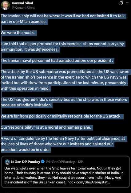 Iranian ship sunk without warning was there at the invitation of India, and was unarmed.