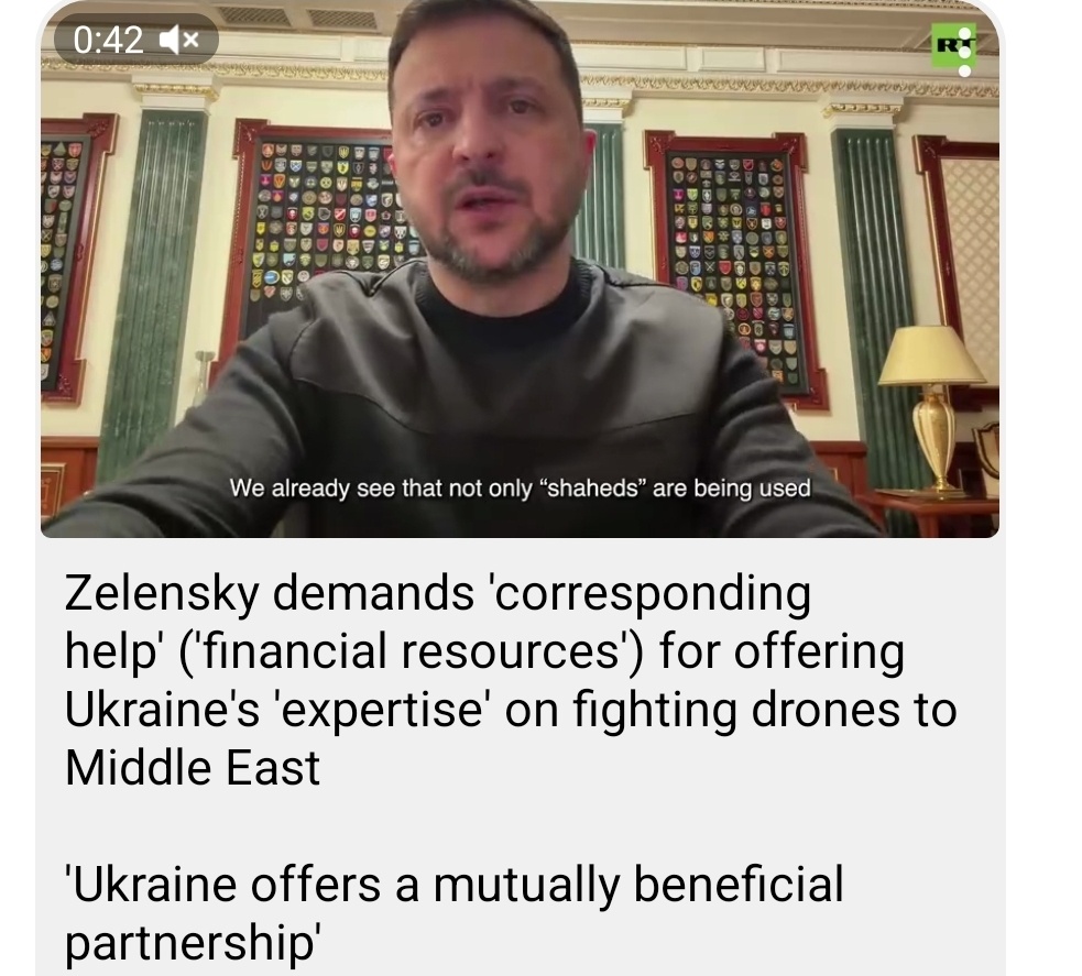 Zelensky demands 'corresponding help' ('financial resources') for offering Ukraine's 'expertise' on fighting drones to Middle East